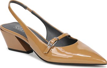 A pointy toe and an angled block heel balance a sleek pump fashioned with a slingback strap for a secure fit.