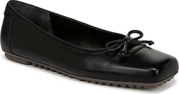 A square toe and driving sole add a flash of contemporary style to this bow-embellished ballet flat shaped from smooth leather.