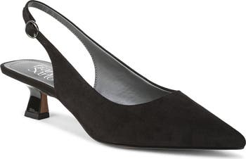 Complete your look with the timelessly classic style of a pointy-toe pump fashioned with a slingback strap and dainty kitten heel.