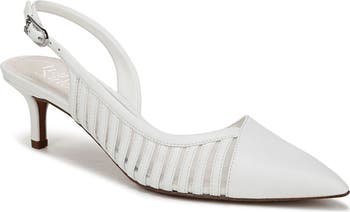 A pointy toe and mesh panels add modern minimalism to a sleek kitten heel pump fashioned with an adjustable slingback strap for a secure fit.