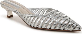 Slender straps kiss at the upper of this faux-leather pointed-toe pump that's situated on a classic kitten heel with embossed branded detailing across the back.