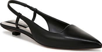 A slightly scalloped topline and pointy toe create a streamlined profile on a striking slingback pump set on a barely-there kitten heel for a hint of height.