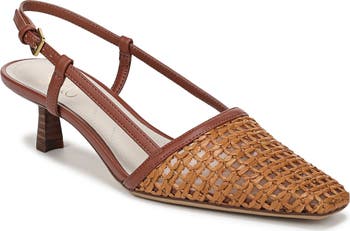 A buckled slingback and artfully woven upper emphasize the vintage inspiration of this season-spanning pump lifted by a flared kitten heel.