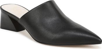 A pointed toe shapes a sleek mule lifted by a flared block heel for versatile work-to-weekend wear.