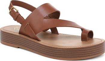 Asymmetrical straps add modern appeal to a sleek slingback sandal grounded by a bold platform sole.
