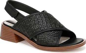 Finely woven straps crisscross over the vamp of of a weekend-ready slingback sandal grounded by a cushioned footbed and low stacked heel for walkable height.