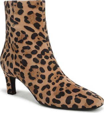 A squared-off toe and tapered heel balance a sleek leather bootie fashioned with a side zipper for easy entry.