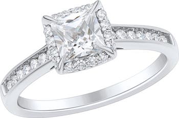 A princess-cut lab-grown diamond and lab-grown diamond halo illuminate this elegant engagement ring crafted from 10-karat white gold.