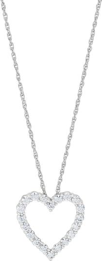 Prong-set round lab-grown diamonds trace the open-heart pendant of this romantic necklace crafted from polished 10-karat white gold.