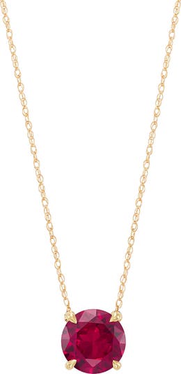 A prong-set round lab-grown ruby sparkles from this dainty pendant necklace crafted from warm 10-karat yellow gold.