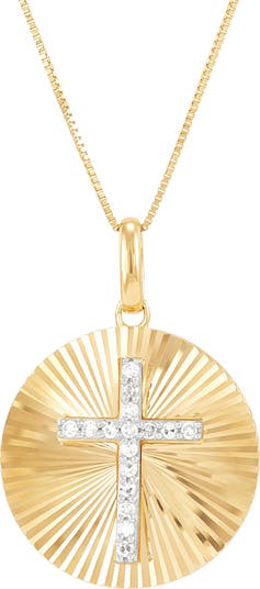 Dainty round lab-grown diamonds sparkle from the cross of this sunray-textured medallion pendant necklace crafted from warm 14-karat gold.
