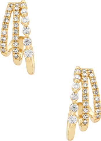 Dainty round diamonds bring luxurious sparkle to these triple-row huggie-hoop earrings crafted from warm 14-karat yellow gold.