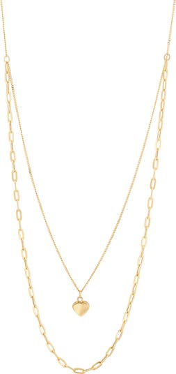 A dainty heart pendant shines from this elegant necklace that layers a mini curb chain and paper-clip chain crafted from warm 14-karat yellow gold.