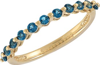 Sparkly round London blue topaz enrich this dainty stackable band ring crafted from warm 14-karat yellow gold.