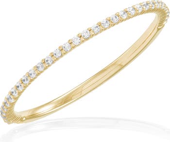 Dainty round-cut diamonds give a bit of sparkle to the slender band of a ring finessed in 14-karat gold for a lasting luster.