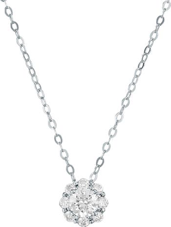 Stunning in its simplicity, this heirloom-quality necklace is anchored by a sparkling round diamond in a halo setting.