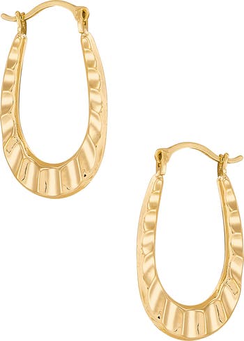 An oval silhouette with a ruffled design adds contemporary shine to these hoop earrings crafted from gleaming 10-karat gold.