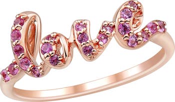 Pretty pink sapphires encrust this slender ring, crafted from romantic 14‑karat rose gold in a 'love' script design.