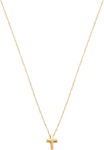 A petite cross pendant adds reverent shine to this delicate chain necklace crafted from polished 14-karat gold.