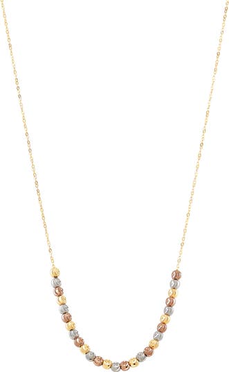 Tricolor beads with a textured finish adds modern shine to this delicate chain necklace crafted from polished 14-karat gold.