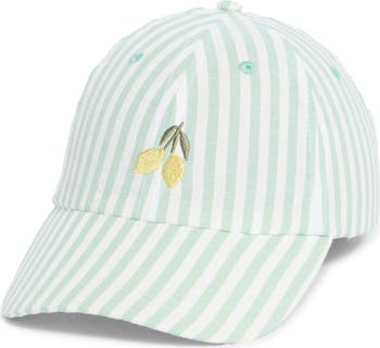 Embroidered lemons amplify the summery vibe of a seersucker baseball cap crafted from durable cotton canvas.
