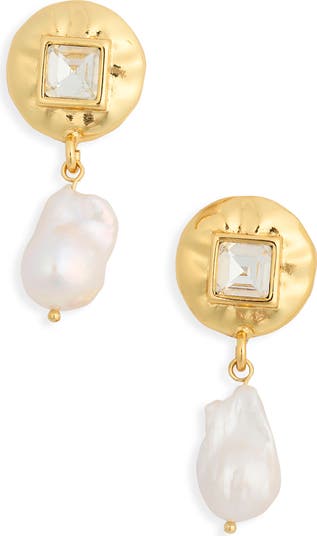 Lustous baroque freshwater pearls suspend from goldtone studs inset with princess-cut crystals.