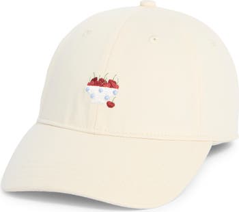 An embroidered bowl of cherries brings ultimate summer style to a baseball cap crafted from durable cotton canvas.