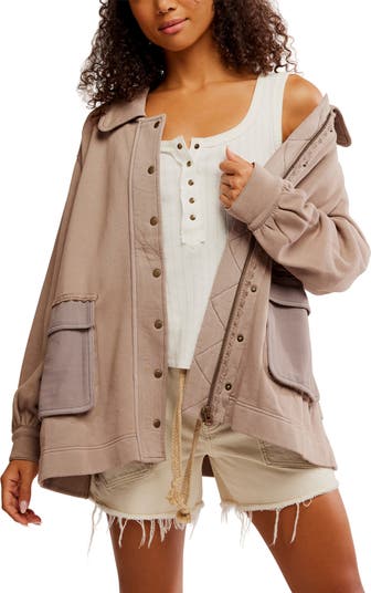 A slouchy, oversized fit and cargo-style flap pockets bring an effortlessly cool vibe to ensembles topped with this comfy cotton-blend jacket complete with a water-repellent finish.