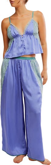 Romance your lounge act in the silky, lace-accented satin of this pajamas that pair a plunging cropped camisole balanced by the fluid silhouette of the wide-leg pants.