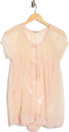 A delicate chiffon overlay with puffy sleeves creates a gauzy film over the sequin-dusted body of this romantic bodysuit traced with delicate lace.
