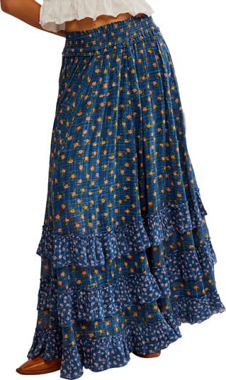 Pure prairie breezes gentle a ruffle-decked maxi awash in a variety of tiny blooms.