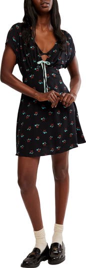 A sweet satin tie punctuates the Empire-waist bodice of this weekend-ready minidress accented with pretty gathers along the short sleeves.