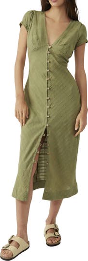 A deeply dipped neckline fronts this textured cotton midi designed with abbreviated sleeves and easy front buttons.