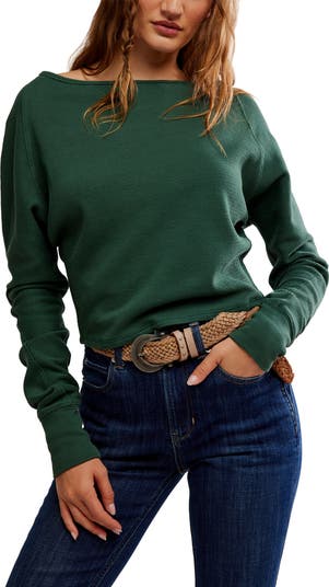 A cozy thermal top is updated in a relaxed cropped fit and made with a wide neckline that dips off the shoulder.