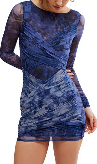 Crisscrossed ruching gives a unique texture to this party-ready minidress cut from stretchy, breezy mesh in a body-con silhouette.