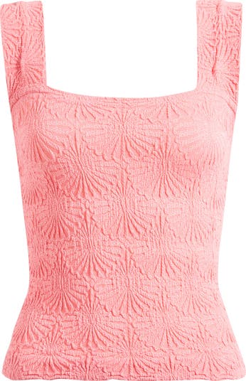 A raised floral pattern brings texture to a knit cami topped with scalloped straps.