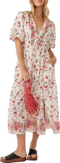Sweet smocking shapes this light and lovely maxi covered in delightful blooms.