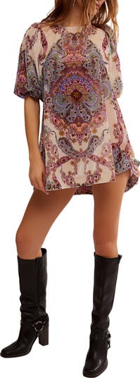 Charming puff sleeves frame this rich velvety tunic covered in a swirling print and punctuated with an airy keyhole back.