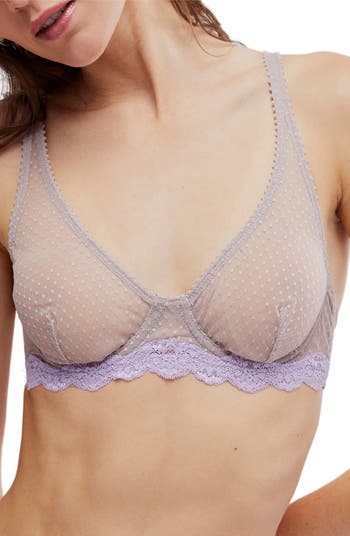 Unlined dotted-mesh cups create a flirty silhouette for this underwire bra finished with scalloped trim.