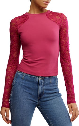 Lace sleeves elegantly frame this svelte jersey top that brings the perfect mix of sporty romance to any look you pair it with.