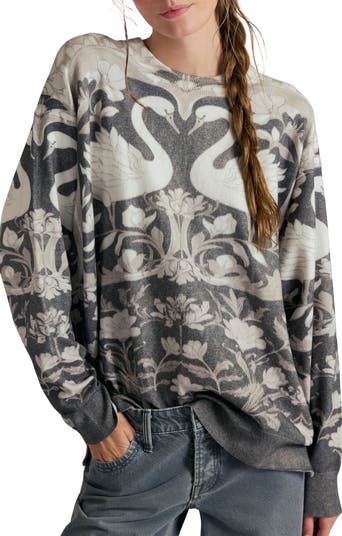 An intricate swan design covers this finely knit wool-kissed sweater made in a contemporary silhouette that evokes vintage style.