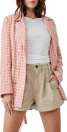 Allover checks enliven this double-breasted blazer tethered with a defining waist tie.