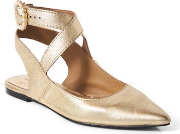 Pearly beads stand out against the circular buckle on a pointy-toe flat rendered in sleek leather for timeless appeal.