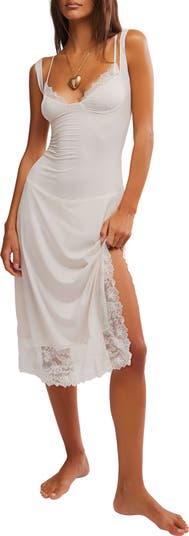 Floral-lace trim adds an air of romance to this stretchy nightgown with a flirty open back.