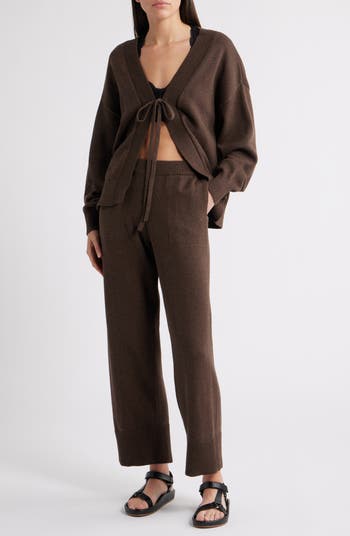 Comfort is key with this matching knit set that includes a slouchy open-front cardigan with dropped shoulders and elastic-waist pants. Both are anchored with ribbed trim and made from supersoft cotton.