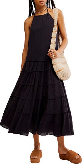 A decadently tiered silhouette and backless design will have you dreaming of somewhere sunny in a halter midi dress cut from fresh cotton gauze.