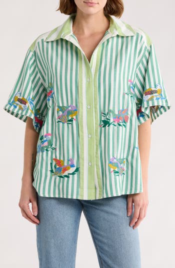 A fanciful embroidered flock takes roost among the stripes patterning this cotton button-up cut for a relaxed fit that lets these feathered friends swing and sway with your every movement.