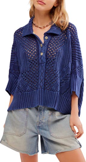 Open stitching and a slightly abbreviated hem lend an airy, laid-back vibe to this polo sweater knit from soft cotton yarns.