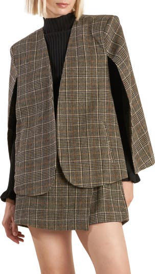 A woven capelet rendered in plaid checks brings modern sophistication to the top of casual or elevated looks.