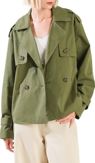 Notched lapels and a double-breasted silhouette enhance the sophisticated appeal of a sturdy cotton jacket that's an everyday must-have.